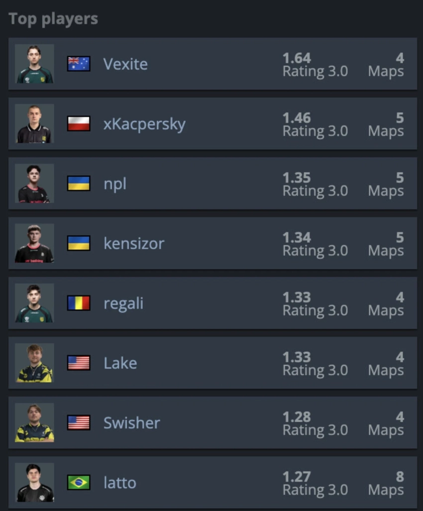 Австралиец Деклан «vexite» Портелли из FlyQuest стал абсолютным королем первой стадии, набив космический рейтинг 1.64 всего за четыре карты. Однако настоящее шоу показала украинская B8: Андрей «npl» Кухарский и Артём «kensizor» Капран оккупировали третью и четвертую строчки топа соответственно. Рифлеры продемонстрировали невероятную стрельбу, закончив этап с мощными показателями 1.35 и 1.34.