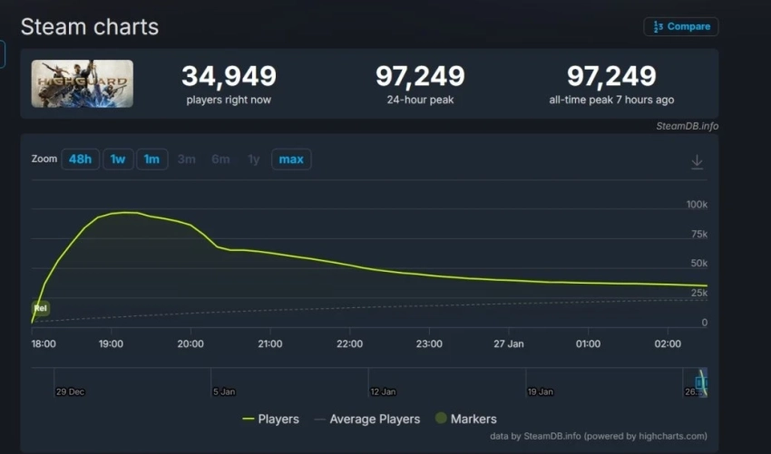 Что до пикового онлайна, то он достиг 97 249 игроков одновременно — это было 7 часов назад. На момент написания в шутере находятся 34 949 игроков одновременно.