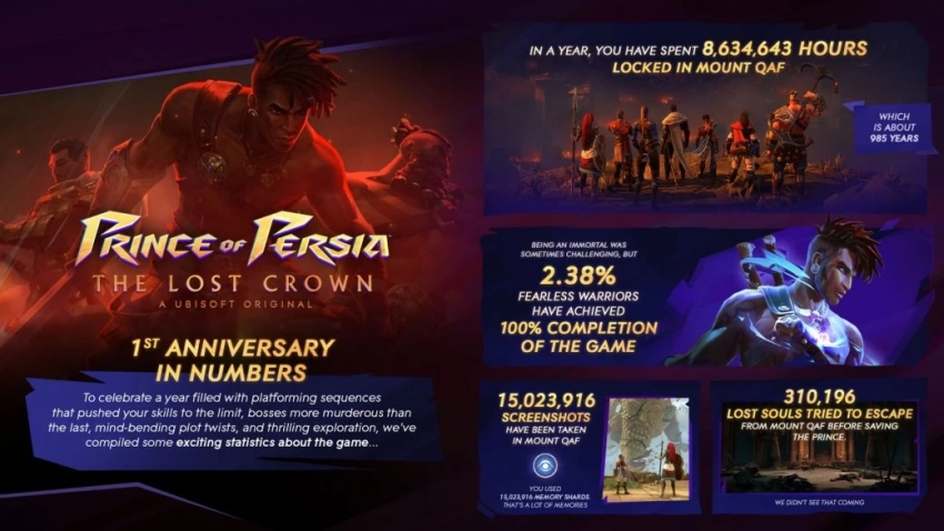 Самое интересное о кино на YouTube канале Игромании!Скриншот Prince of Persia The Lost CrownНа днях отметила свою первую годовщину приключенческая метроидвания Prince of Persia: The Lost Crown — релиз игры состоялся 18 января. Ubisoft уже отметила это событие специальным трейлером. А теперь компания опубликовала статистику за первый год игры.