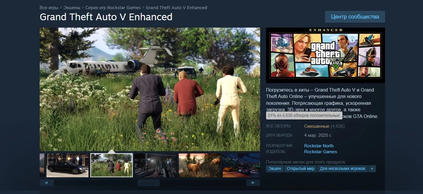 А вот пользовательский рейтинг набрался «смешанный». На GTA 5 Enhanced написано более 4,5 тыс обзоров, но из них только 51% положительные.