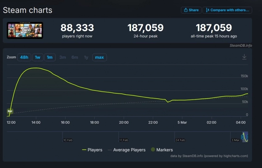 И её пиковый онлайн в Steam довольно быстро поднялся до отметки 187 059 игроков одновременно.