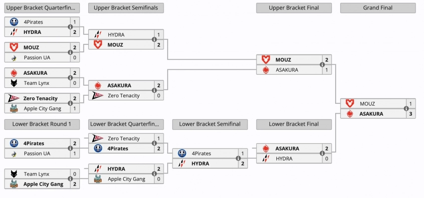В плей-офф матчи также проходили в формате Bo3. Команда ASAKURA продемонстрировала уверенную игру на всех стадиях турнира. Коллектив занял второе место в своей группе и проиграл в финале верхней сетки плей-офф.