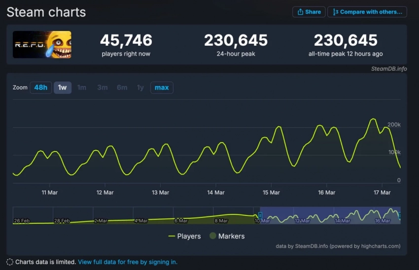 R.E.P.O. приобрела большую популярность благодаря сарафанному радио — пик онлайна новинки в Steam уже перевалил за 230 тысяч человек.