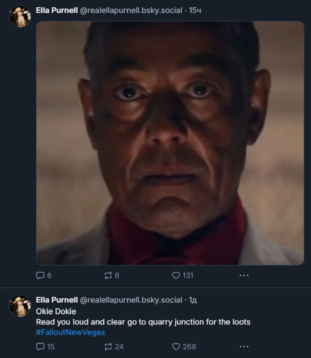 «Мне посоветовали поиграть в Fallout: New Vegas. Поскольку мне нравятся некоторые исходные материалы, и это может быть подготовкой к определённой работе, которой я могу заняться в ближайшее время, а может и нет. Очевидно, что время не на моей стороне, чтобы изучить всё вовремя. Я всё равно буду поглощена игрой, пока меня не позовут в Пустошь», — поделилась Элла.