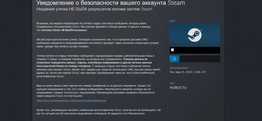 Вам не нужно менять свои пароли или номера телефонов из-за данного инцидента. Однако это хорошее напоминание о том, что к любым сообщениям о безопасности аккаунта, которых вы не запрашивали, следует относиться с подозрением. Рекомендуем регулярно проверять безопасность своего аккаунта Steam по этой ссылке.