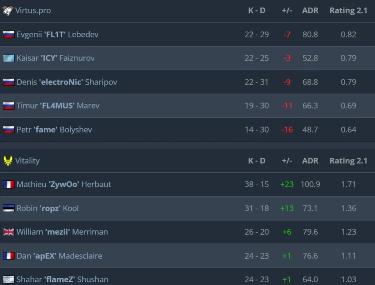 После неожиданного поражения от Legacy в первом раунде, Vitality уверенно держит позицию, проигрывая в среднем всего пять раундов за карту. Это даёт команде уверенность в борьбе за очередной трофей в этом сезоне.