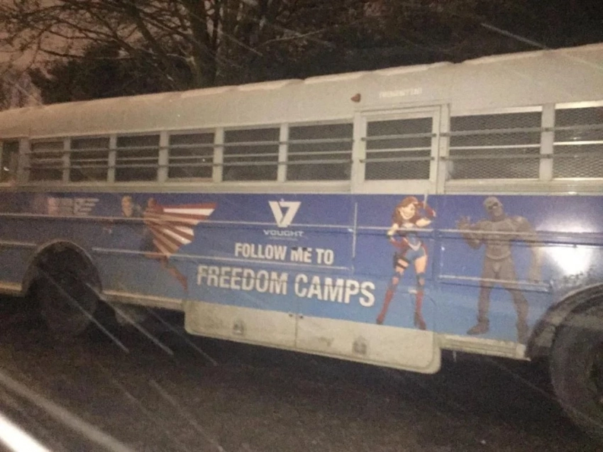 На фотографиях мы видим в основном машины: школьный автобус, разукрашенный приглашениями в Лагеря свободы, джип с изображениями Teenage Kix, а также принадлежащий Vought полицейский фургон. Всё это наводит на мысль, что нас ждут весьма мрачные события.