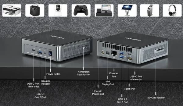 Компьютер оснащен беспроводным интерфейсом Wi-Fi 5. На передней и задней панелях MiniAir 11 находятся следующие порты: два USB 3.2 Gen 1 и один USB 3.2 Gen 2, два USB Type-C (только для данных), один слот для карт SD, один разъем для наушников 3,5 мм, порт Ethernet RJ45, по одному видеовыходу HDMI 1.4 и Mini DisplayPort. Также предусмотрен разъем для блока питания и Кенсингтонский замок. Габариты компьютера составляют всего 117 × 112 × 34,2 мм, а вес – 500,3 г, что обеспечивает легкость переноски системы GEEKOM MiniAir 11 в любое место.