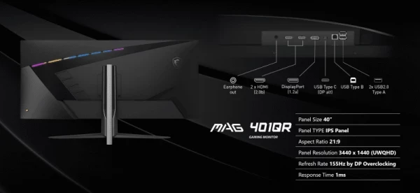 В оснащение MSI MAG401QR входят два порта USB 2.0 Type-A, один восходящий USB 2.0 Type-B и один USB 2.0 Type-C с возможностью передачи до 65 Вт на внешнее устройство, что позволяет заряжать от него, например, ноутбук или смартфон. В число видеоразъёмов новинки входят два HDMI 2.0b и один DisplayPort 1.4a. Также имеется один 3,5-мм аудиовыход.