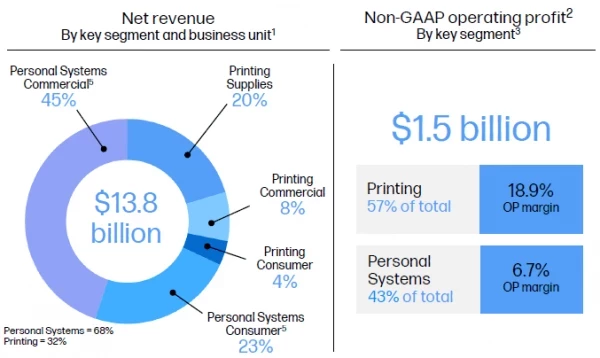 Если рассматривать весь минувший фискальный год, то выручка достигла $53,7 млрд, сократившись на 14,6 % по сравнению с предыдущим, из этой суммы 66 % пришлось на сегмент персональных систем, а 34 % на сегмент печатающих устройств. В коммерческом сегменте 46 % выручки определяли ПК, а вот расходные материалы вышли на второе место по важности с долей выручки 21 %, тогда как в потребительском сегменте ПК формировали только 20 % всей выручки HP Inc. Наконец, устройства печати по итогам года определили 8 % выручки на коммерческом направлении и 5 % в потребительском сегменте. Операционная прибыль в размере $5,5 млрд на 61 % определялась печатающими устройствами и расходными материалами, и только на 39 % персональными компьютерами.