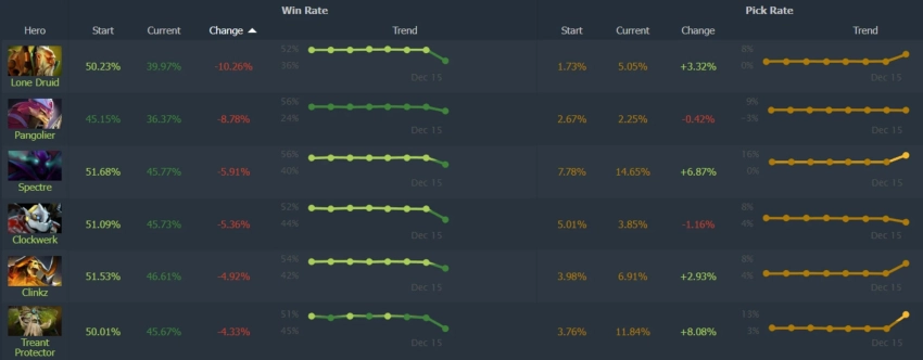 Статистика героя Lone Druid показала катастрофическое падение: доля побед персонажа снизилась сразу на 10,2%. Это связывают с масштабными изменениями механик: разработчики не только переработали способности героя, но и полностью удалили его аспекты, что заставило игроков заново искать эффективные билды.