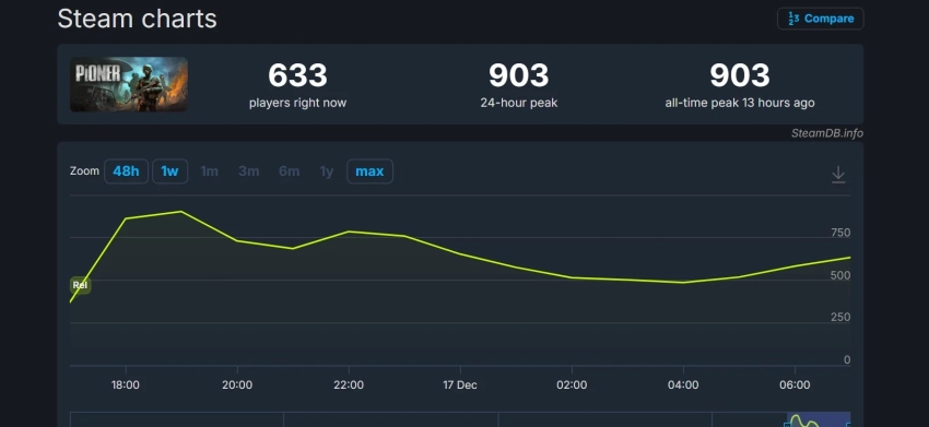 PIONER добавило в свой список желаемого Steam более 500 тысяч игроков до релиза, однако это не спасло шутер от низкого онлайна. Его пик пришёлся на первые часы после выхода в раннем доступе — тогда в игре находилось 903 человека. При этом резкого отката назад не было (свыше 600 игроков в момент написания новости), поэтому потенциально шутер обновит личный рекорд на выходных или с помощью будущих обновлений.