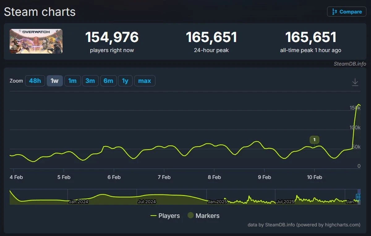 Обложка: скриншот OverwatchOverwatch (2023), перезапущенная вчера, вызвала нешуточный ажиотаж среди пользователей в Steam. Что в свою очередь привело к новому рекорду пикового онлайна — на момент публикации новости он составил 165,651 одновременных пользователя.