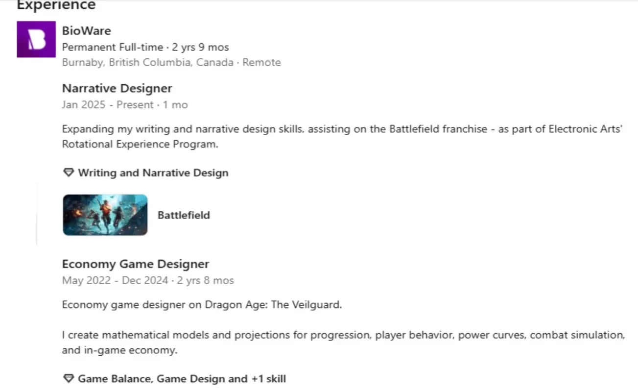 Резюме сотрудника BioWare