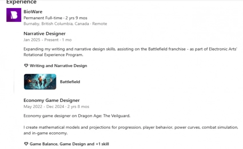 Речь идёт о Хареле Эйламе. В Dragon Age: The Veilguard он занимался проработкой экономики и математических моделей таких важных систем, как прогрессия игрока и сражения. С января 2025 года разработчик стал нарративным дизайнером грядущей Battlefield в рамках программы обмена опытом среди студий Electronic Arts.