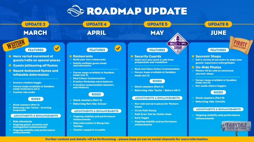 Разработчики также выпустили первый тизер будущего шестого обновления. Оно посвящено пиратской тематике, но помимо пиратов в игру прибудут новые функции. В частности, это сувенирные ларьки, в которых посетители смогут приобрести безделушки и собственные фотографии, снятые во время поездки на американских горках.