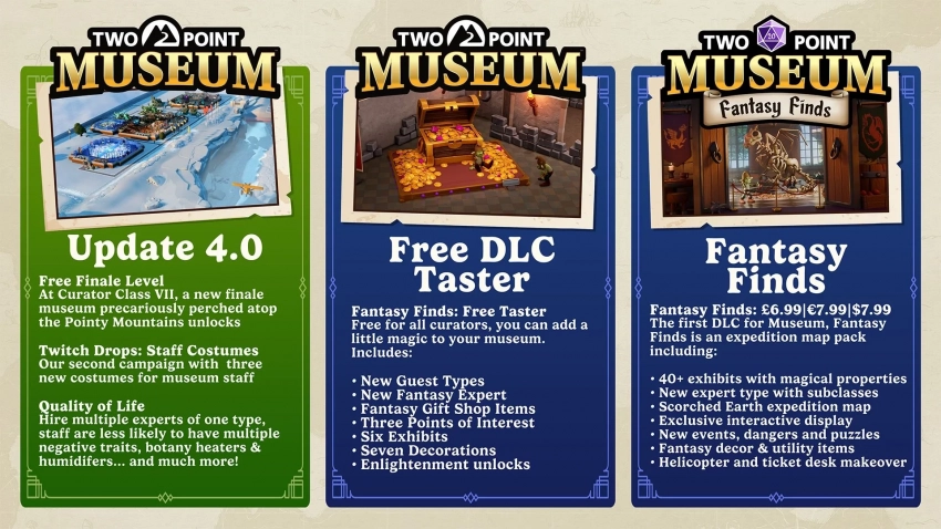 Для всех остальных точек интереса и связанных с ними целей и предметов потребуется полное дополнение Fantasy Finds, которое выйдет 17 июля. Узнать подробности о нём и о новшествах патча 4.0 можно на странице Two Point Museum в Steam.