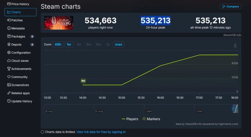 Главные новости » Все об играх » Пиковый онлайн Hollow Knight: Silksong в Steam превысил 500 тысяч игроков